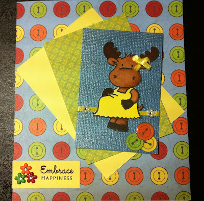 So For this challenge, I used the adorable Expecting Sophie stamp from the Riley and Company and colored her in with Copics. Sophie was then fussy cut out and adhered to three mats that were fanned out. To incorporate the button theme, I used this button paper I found in Hobby Lobby a year or so ago. I glossy accented a couple of the buttons and them cut them out to add some interest to the bottom of the blue square. A yellow ribbon was used to give Sophie a bow as well as some interest to her frame. The two pearl flowers are actually nail art stickers I picked up at the drug store.